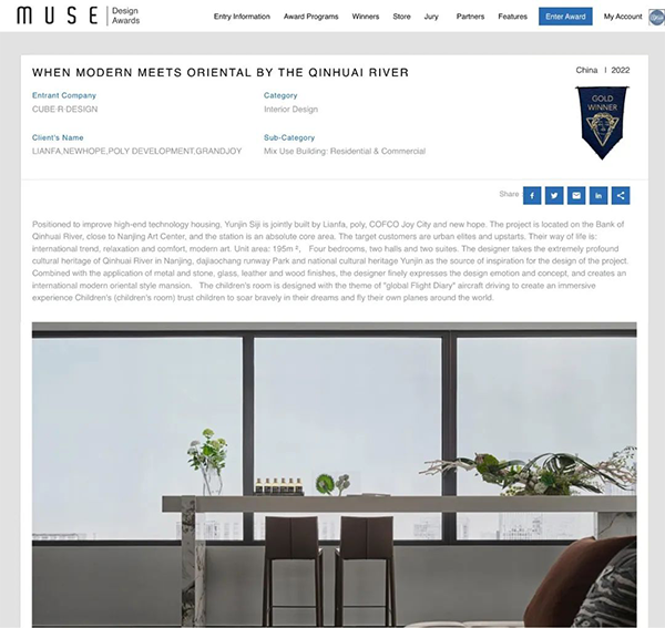 喜讯丨CRD臻珈设计荣膺美国缪斯奖金奖:摩登现代与东方艺术相遇在秦淮河畔